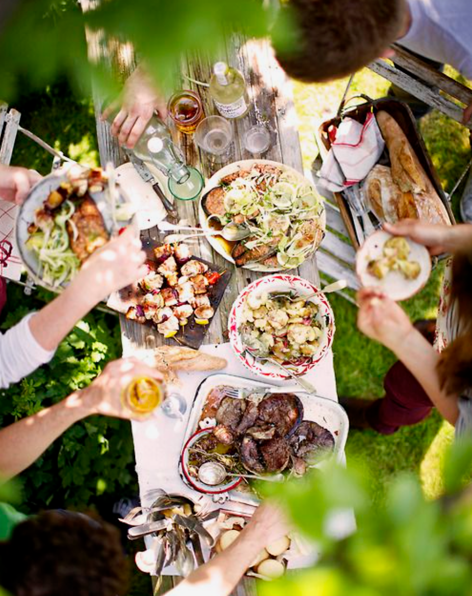 Capture a candid moment of a family or friends enjoying a casual meal outdoors, emphasizing the joy of coming together