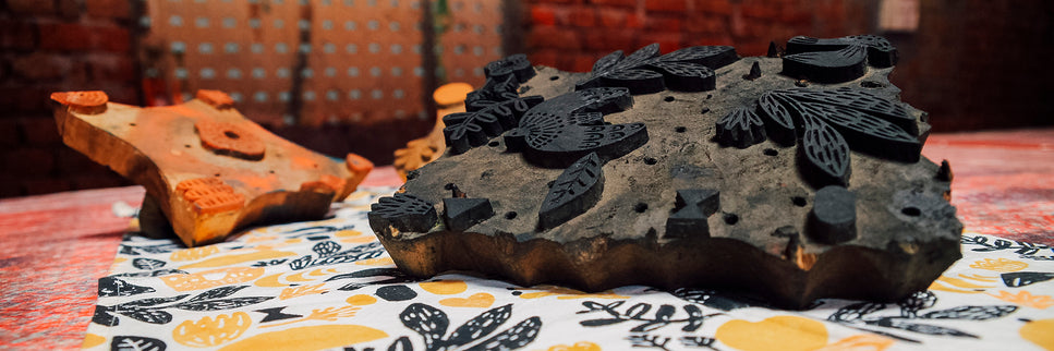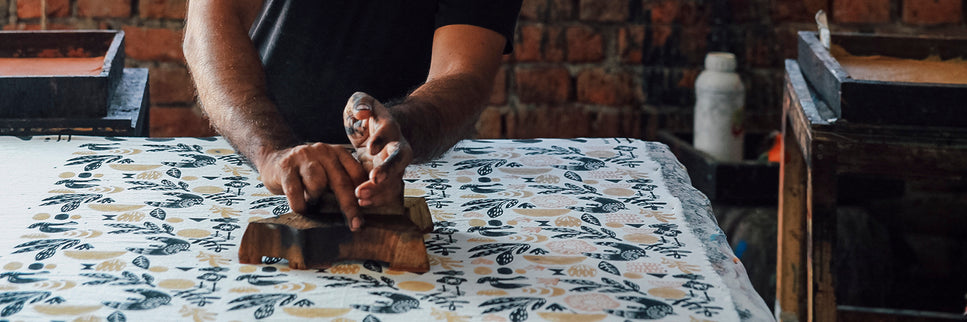 A centuries-old technique, the block print process begins with a relief pattern carved into blocks of wood. Depending on the detail and intricacy of the design, the carving of the wooden block can take anywhere from hours to weeks to complete. The block is then covered with ink and meticulously stamped across the surface of the textile.