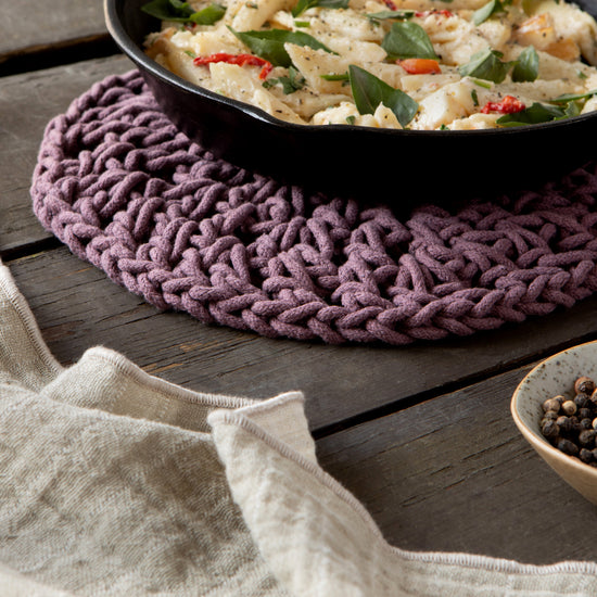 Set a hot pot or pan down on a handmade knotted trivet. Thick cotton rope provides protection and durability, while offering textural intrigue. Part of the Medley collection of color-coordinated kitchen and table linens from Danica Heirloom.