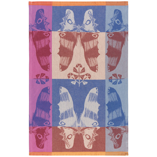 A bold and geometric pattern is featured on this durable jacquard Aurora dishtowel. Spring dawns and a sunrise of color graces the butterflies wings of this design from the Aurora collection.