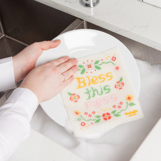 Breeze through everyday kitchen tasks with this Ecologie Swedish dishcloth. A delightful, vintage-inspired motif emulating a cross-stitch sampler gently coaxes your inner domestic goddess to emerge. Made from FSC-certified plant-based cellulose fibers and cotton, this 100% natural, nontoxic and compostable sponge cloth is a household staple in Scandinavia. Sourced from authentic Swedish manufacturers, each thin cloth expands to become soft and pliable when wet and holds 15 times its weight in water or liquids, making it highly absorbent and useful when washing dishes or cleaning up spills. Leave paper towels off your shopping list and switch to this reusable alternative. This versatile dishcloth can wipe counters and quickly soak up wet messes in the kitchen, but it's also ultrapractical for cleaning tasks all around the home. Use it with almost any cleaning product to wipe mirrors or spotty faucets in the bathroom, leaving a streak-free finish. Its lint-free design makes it the ultimate choice for a clean, polished look.