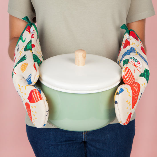Baubles bedecked with smiling snow people, snowflakes charm their way onto these printed oven mitts. Made from 100% cotton, these heat-resistant oven mitts are lined and insulated. Easy-care, gift-ready, and sure to be a welcome addition to any chef’s kitchen.