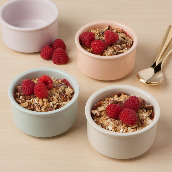 Whether it's crème brulee, crumble or clafoutis, individual desserts are elevated with these pastel ramekins. Stackable shapes make them easy to store when not in use. Comes packaged in a giftable box.