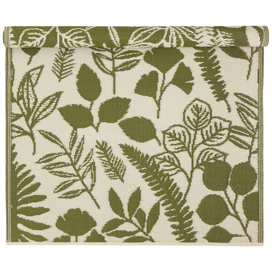 This stylish Fern & Frond rug is perfect for your deck or patio. Made of 100% recycled materials, it's easy to care for and even easier on the eye. A lush ode to nature, Fern & Frond features layered leafy botanicals in earthy green and soft cream. Enduringly fresh, this collection pairs organic elegance with modern color blocking for year-round beauty.