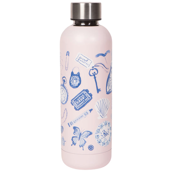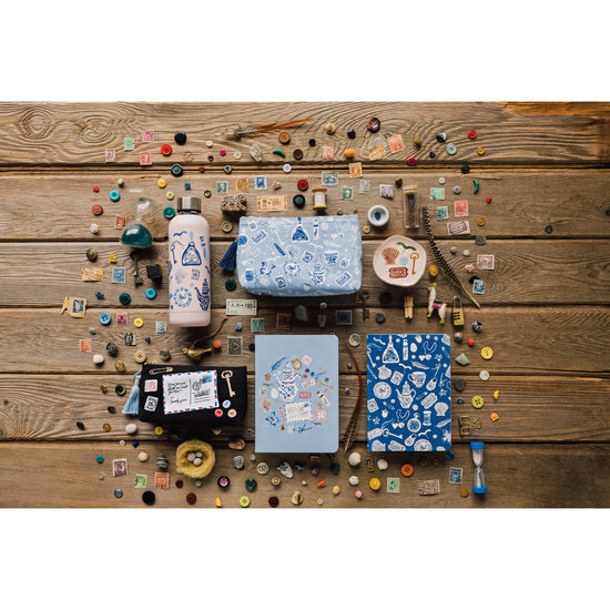 Enter into a magical realm of memories and keepsakes with our Finders Keepers Water Bottle. Its delightful design features an eclectic array of tiny trinkets, treasures and mementos set in a classic, antique blue and white coloring that lends itself to the nostalgic nature of the illustrations.