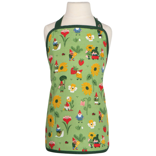 Mini chefs will look the part with a Gnome Grown kid apron that fits just right, thanks to wide, easily adjustable straps. Enter the enchanting world of Gnome Grown! Delight in the hidden magic of the garden, where red-capped gnomes, industrious snails, and a canopy of bright blooms bring a nostalgic, storybook charm to this apron.
