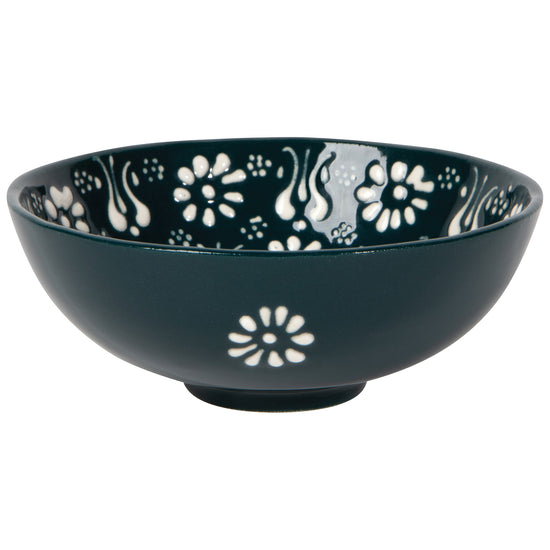 Alive with a pattern and color evocative of classic Turkish artistry, the 5 inch diameter Forest Evani hand painted bowl is a joyous expression of global tastes and traditions.