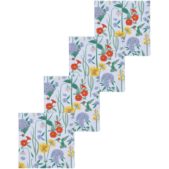 This set of four Hummingbird napkins is a great addition to kitchens and dining rooms: indoors and out. Each napkin measures 18-inch square. Portrayed in their delicate dance, our Hummingbird collection celebrates these tiny winged jewels and their floral favorites. Intricate linework and bright garden hues enliven this enchanting assortment.