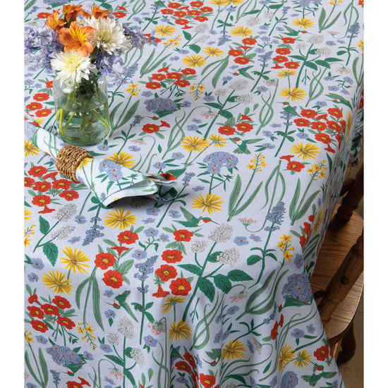 Set the table with this elegant 60x90in Hummingbird tablecloth. Perfect for hosting a dinner party or to give as a housewarming gift. Portrayed in their delicate dance, our Hummingbird collection celebrates these tiny winged jewels and their floral favorites. Intricate linework and bright garden hues enliven this enchanting printed tablecloth.