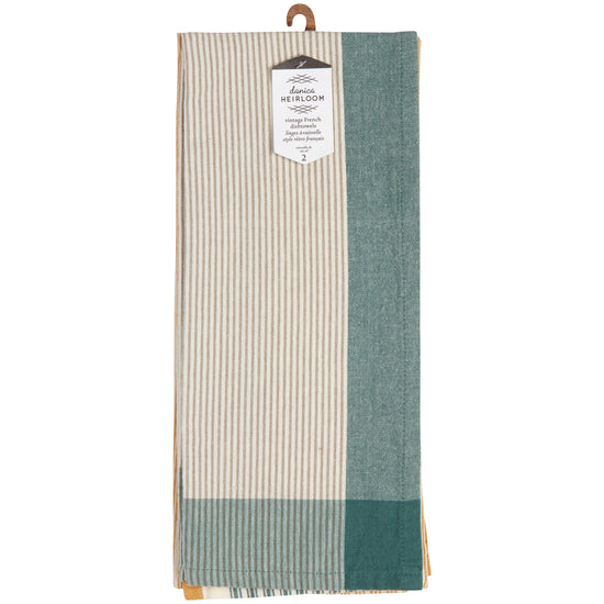 A hint of vintage meets the modern kitchen in these subtly-striped and banded dishtowels. Each towel in this set of two is enzyme-washed, adding softness, texture, and absorbency.