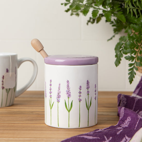A sense of freshness and calm fills the kitchen with this elevated Lavender Honey pot. Golden honey makes its home within the gentle curves and notched lid of this stoneware pot. A birch dipper makes drizzling easy. Floral favorites delight with this design from the Lavender collection.