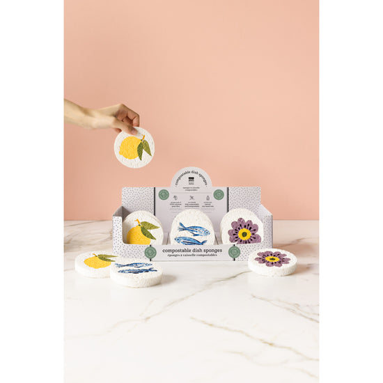 One for me, one for you — compostable sponges make design-savvy and eco-conscious additions to gifts and purchases. Our counter display keeps these lovely printed sponges in view and top of mind.