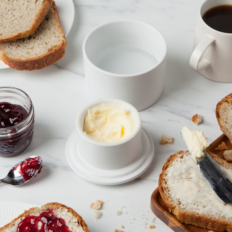 In buttery soft colors, your kitchen gets an easy upgrade with these crocks. Designed to keep this kitchen staple fresh, readily spreadable, and at the ready for all of your culinary creations.