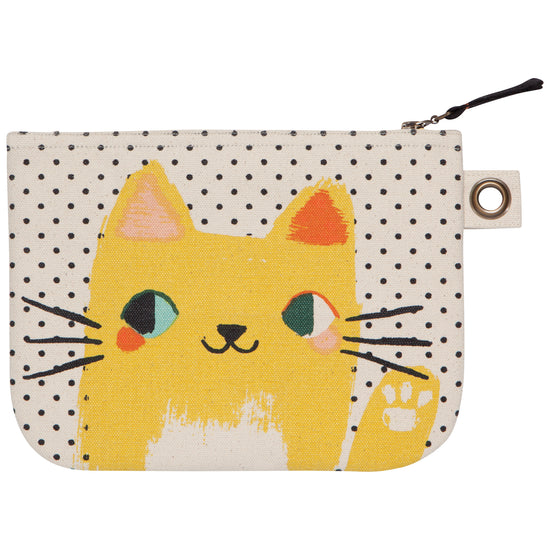 Access belongings easily when you store them in this Meow Meow Large Zip Pouch by Danica Studio. A cheeky yellow kitty on a polka dot background smiles and waves, giving this spacious zip pouch a playful presence that pairs well with casual purses.