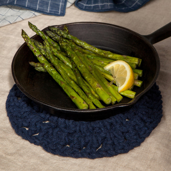 Hand knotting creates textural interest and a unique organic style for this one-of-a-kind trivet. The thick cotton rope provides heat protection and durability.