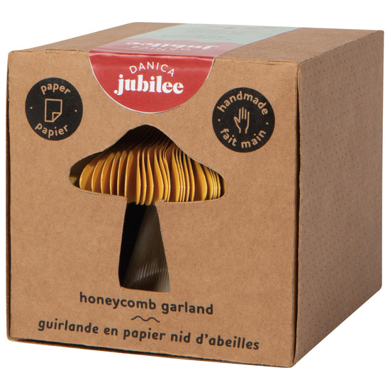 Our handcrafted honeycomb Mushroom Gems garland will fill the holiday home with lighthearted allure. Made with recycled paper, each Christmas garland folds up neatly for storage to be enjoyed year after year. Emerging from the forest floor, these rare beauties are fine forms of fungus for the holidays.