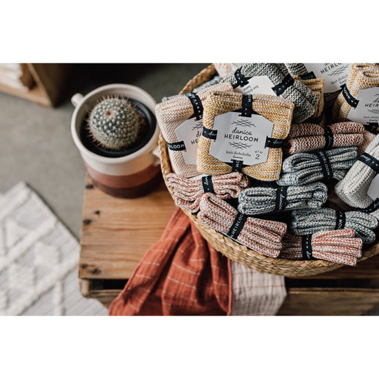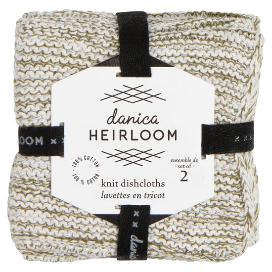 Sets of two hand-knit dishcloths are soft on the hands yet tough on dirty dishes. Part of the Medley collection of color-coordinated kitchen and table linens from Danica Heirloom.