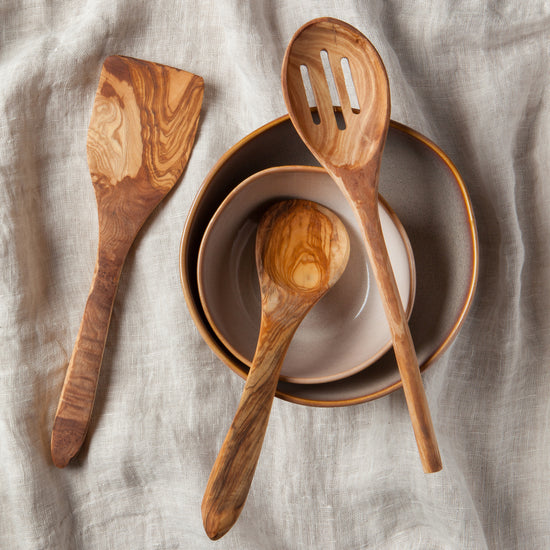 Olive wood radiates the warmth and richness of a Mediterranean grove. A hardwood, it is sustainable and long-lasting. Our olive wood kitchen utensils and serveware are made in Tunisia and are responsibly sourced from the non-producing branches of olive orchard trees. Grain patterns and colors vary from piece to piece - each one will be unique. Safe for use on non-stick cookware.
