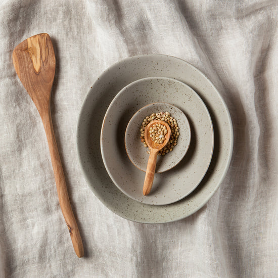 Olive wood radiates the warmth and richness of a Mediterranean grove. A hardwood, it is sustainable and long-lasting. Our olive wood kitchen utensils and serveware are made in Tunisia and are responsibly sourced from the non-producing branches of olive orchard trees. Grain patterns and colors vary from piece to piece - each one will be unique. Safe for use on non-stick cookware.
