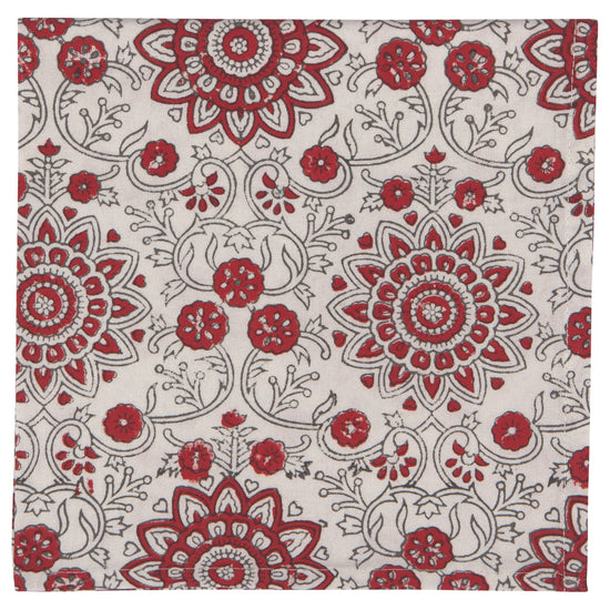 Rich blooms cascade across a cotton canvas, making a garden come to life on cloth. Hand block-printing holds a long and rich history in Indian textiles. It's a skilled craft, shared generation to generation. Each wooden block is hand-carved and then stamped in ink and applied with studied expertise to the fabric to create a complex and interconnected pattern. When you spread a hand block print cloth on a table, the artistry shines through, and the beauty can be found in the variations of each print.