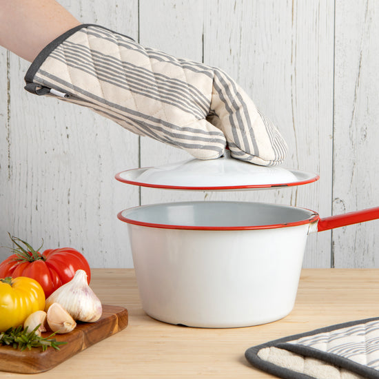 The Superior Pencil Stripe Oven Mitt by Now Designs is made from cotton twill fabric, making it flexible, durable, and washable. The mitt's interior is made of a heavy-duty terry lining for great comfort and heat protection. The quilting pattern is designed for improved dexterity. Measuring 7 inches wide and 13 inches in length, this Superior Oven Mitt provides extra coverage when handling hot dishes. It also features an end hook for convenient storage.