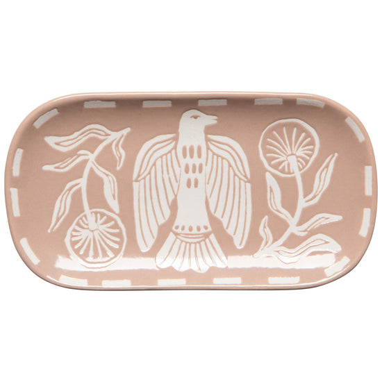 The intriguing shape of the Peregrine trinket tray imprinted with a unique Danica Studio design makes it a delightful addition to your desk, dresser or anywhere else you want to collect your treasures. Peregrine's majestic birds of prey bring natural elegance to your home. With an earthy tone and organic texture, this tray captures the splendor of powerful wings soaring over fields of wild blooms—elevating everyday moments with bold yet graceful beauty.