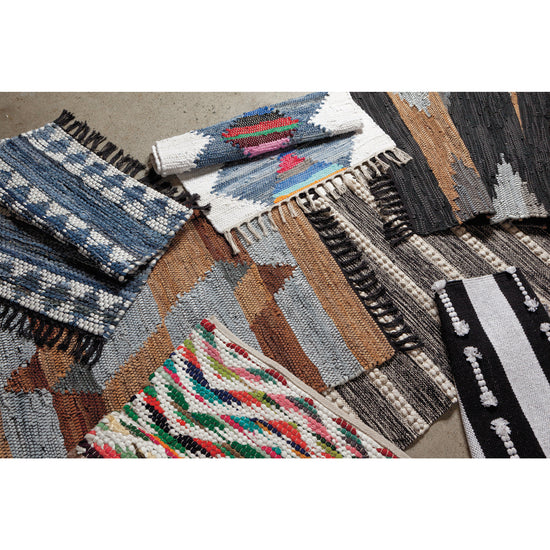 Authentically crafted in India using up-cycled cotton fabric scraps, these rugs add a colorful pop to any space in the home. The fabrics are chosen at random and woven by hand by skilled weavers. Each piece is unique.