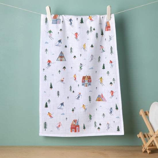 Add life and character to your kitchen with our fun and colorful printed Ski Ya Later woven cotton dishtowel. A perfect combination of form and function, this towel will make washing up less of a chore. Glide and carve, swoop and slide, strap on those skis, and go for a ride! Snow-covered slopes and fresh winter air clear out the mind of any worry or care.