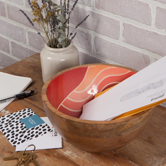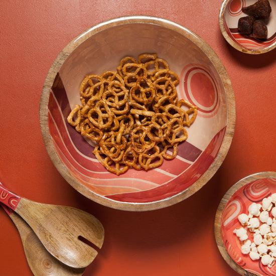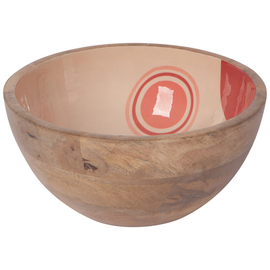 Curvy sweeps of color combine with elegant styling in the Solstice Mango Wood Serving Bowl from Danica Studio. Warm shades against a soothing blush background welcome your guests, promising a wonderful evening of fun and fellowship.