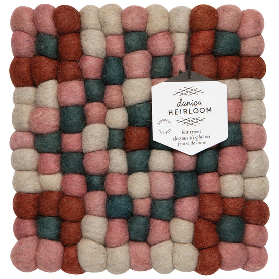 Each cozy woolen trivet is hand-felted and connected creating an unusual, textural statement for the kitchen or table. Made from thick recycled wool felt balls, this trivet will protect your countertop from hot pots and pans.
