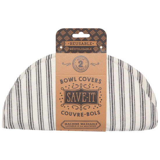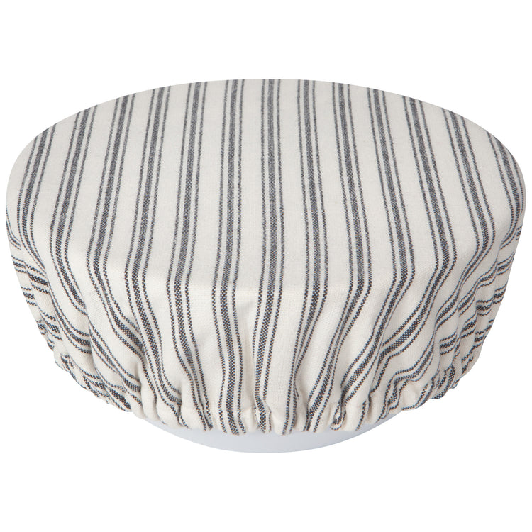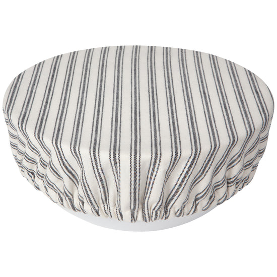 Proof dough or pack away favorite leftovers using this set of two Ticking Stripe Bowl Covers by Now Designs. The traditional charcoal color and striped pattern fit easily into a variety of kitchen decor schemes.
